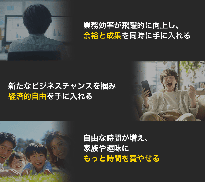 『生成AI速習ウェブセミナー』では、「業務効率化」「経済的安定」「趣味の充実」それぞれの目的に合わせた最新のお勧めツールおよびその使い方を無料でお教えします。