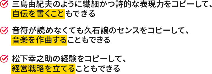 これらをうまく使いこなせる人は、まるで「天才科学者の脳をコピー」し、「芸術家のセンスをコピー」し、「達人の経験をコピー」できるかのように、自分のできることを拡張することが可能なのです。