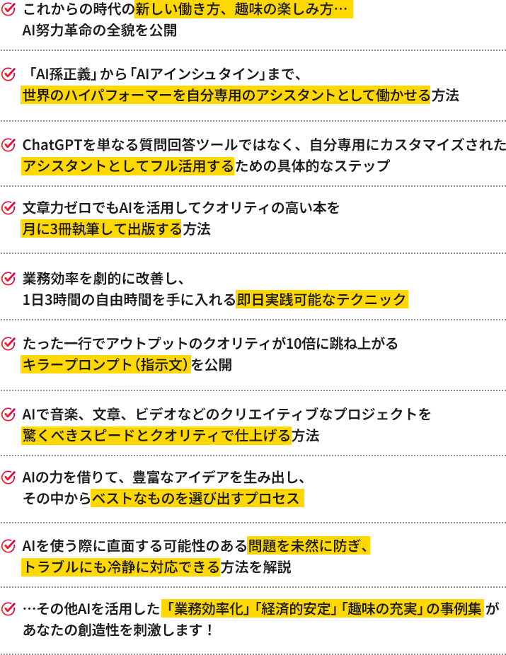 AIを使えば、仕事は劇的に効率化され、会社での評価も上がり、待遇も自然とよくなっていきます。私の教え子たちの中には、AI活用を通じて新たなビジネスの可能性を広げ、大きな成功を収めた人もいます。